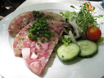 Sülze (carne en gelatina) con vinagreta y ensalada, la medida de los cortes son a la alemana,claro, y pienso…lo que es hambre, no voy a pasar :-).
