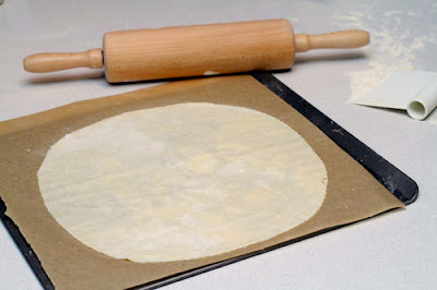 Ahora la preparamos en casa, es una recta muy fácil y rapidísima. La masa la hicimos con 100 gr de harina, 50 gr de agua, y una pizca de sal, nada más, sin de levadura. El secreto es conseguir una masa bien fina, casi transparente.