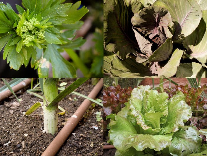 Dejando florecer el apio para conseguir semillas, esperando que la lombarda llegue a tiempo, y los reyes, el puerro y la lechuga.