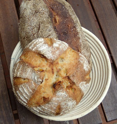 El de orejones es un clásico, ya lo publicamos aqui y aqui. El pan de higos y anís ,sería más o menos así; para un pan 500 gr, 250 gr. harina blanca, 150 gr. masa madre y 125 gr .de agua, una cucharadita de sal, dos cuacharaditas de semillas de anís y dos puñados de higos secos. He puesto los higos en un poco de agua caliente y los he dejado a remojo, mientras amasaba el resto de ingredientes (he añadido un poco del agua de los higos, –según convenga-), al final los he incorporado a la masa.