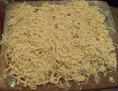 Hay que ir con cuidado, cuando hay tanta pasta hecha, si se deja mucho tiempo antes de cocinar, puede que se peguen los spaguettis, una solución sería colgarlo. Lo mejor es hacer la pasta cuando se vaya a cocer, no esperar mucho tiempo. Tambien se puede dejar secar un poco las «lenguas», antes de cortar los spaguettis, de algún sitio limpio y separados unas de otras.