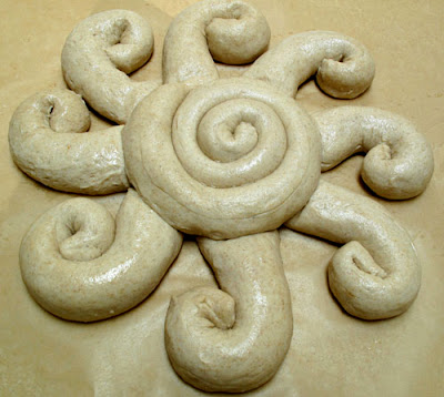 Masa fácil de manejar y moldear. Se divide en dos partes, una será para el espiral del centro y el resto para los rayos. Primero colocaremos éstos, teniendo en cuenta la distancia entre ellos, luego creceran y puden besarse, que suena mejor que pegarse. Se pueden hacer más finos, (una es que es un poco rústica) lo importante es tener en cuenta que tanto el espiral como los rayos sean del mismo grosor para que se hornee en el mismo tiempo y no correr el riesgo que los rayos del Lorenzo se quemen.