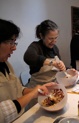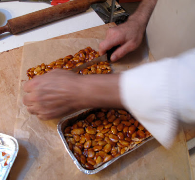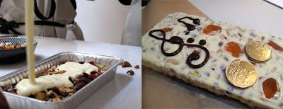 Una muestra de varios de los turrones que se elaboraron en el taller, turrón Músic de Palau, dedicado a F.Bitllet :-). Una combinación de turrón de Jijona y chocolate blanco con piñones ,y el de chocolate, que como podéis ver, la tentación venció y lo catamos en el taller.